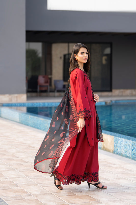 Crimson Red 3-Piece Embroidered Cotton Silk Suit | ZM-37