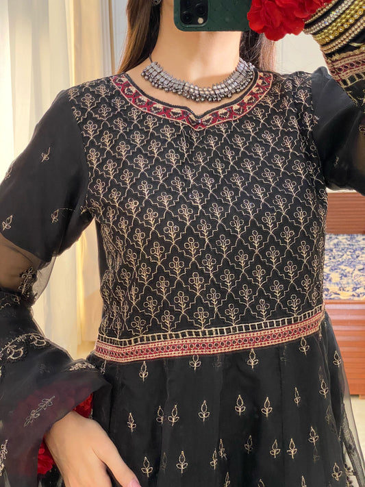 Black 3-Piece Embroidered Frock | ZM-35