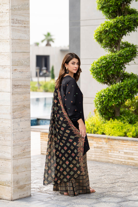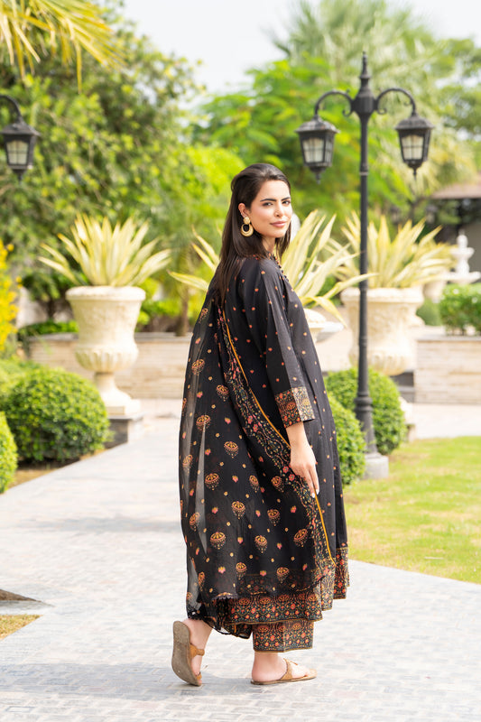 Black 3-Piece printed Cambric Lawn Suit | ZM-31