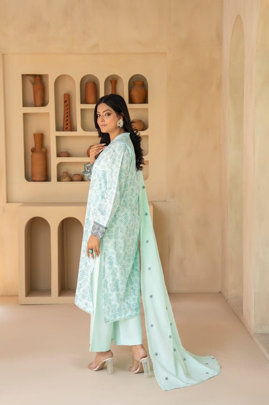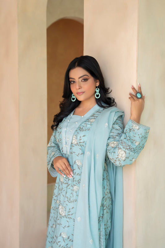 Elegant Aqua 3-Piece Cambric Lawn Suit with Embroidered Dupatta| ZM-19