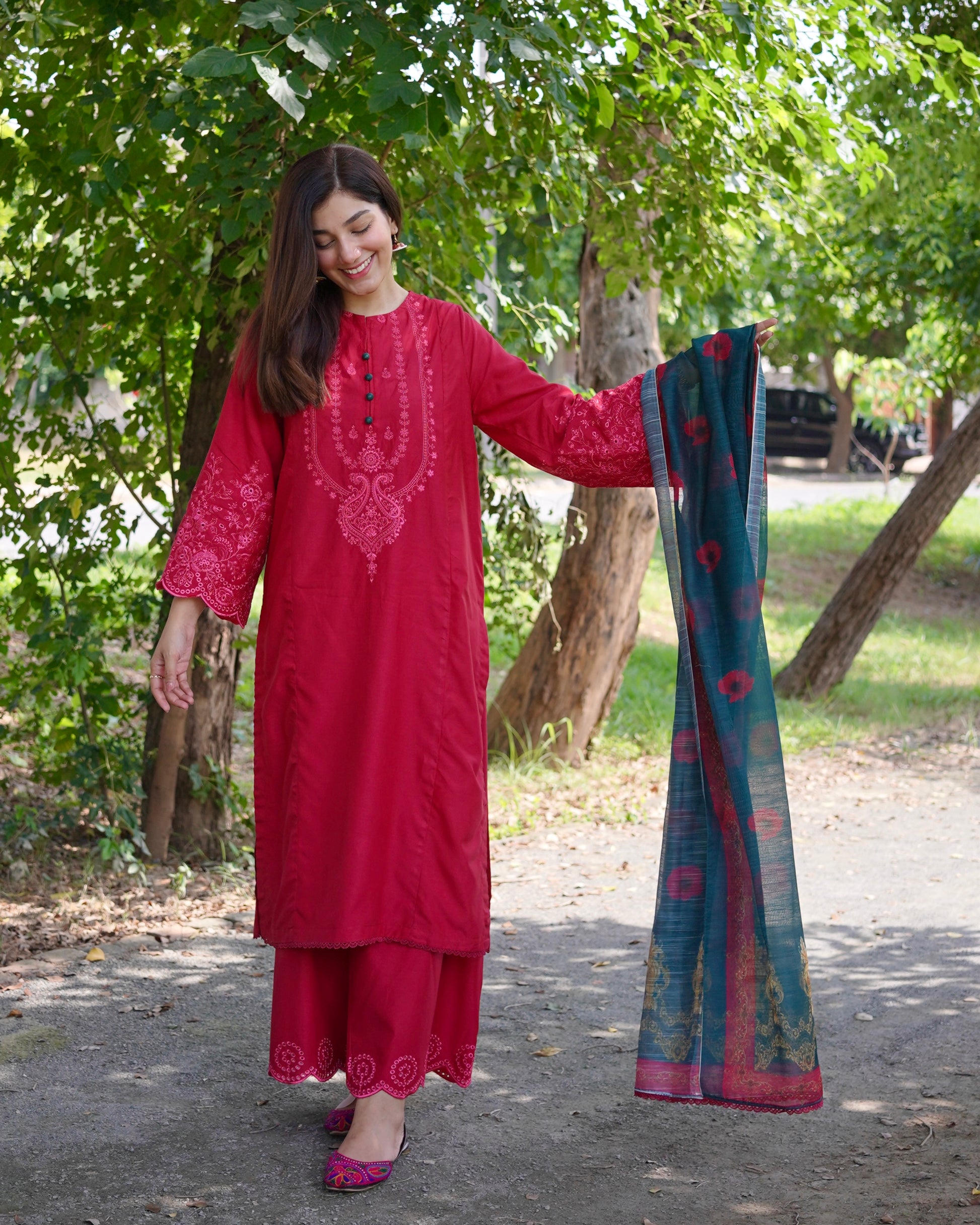 Crimson Red 3-Piece Embroidered Cotton Silk Suit | ZM-37