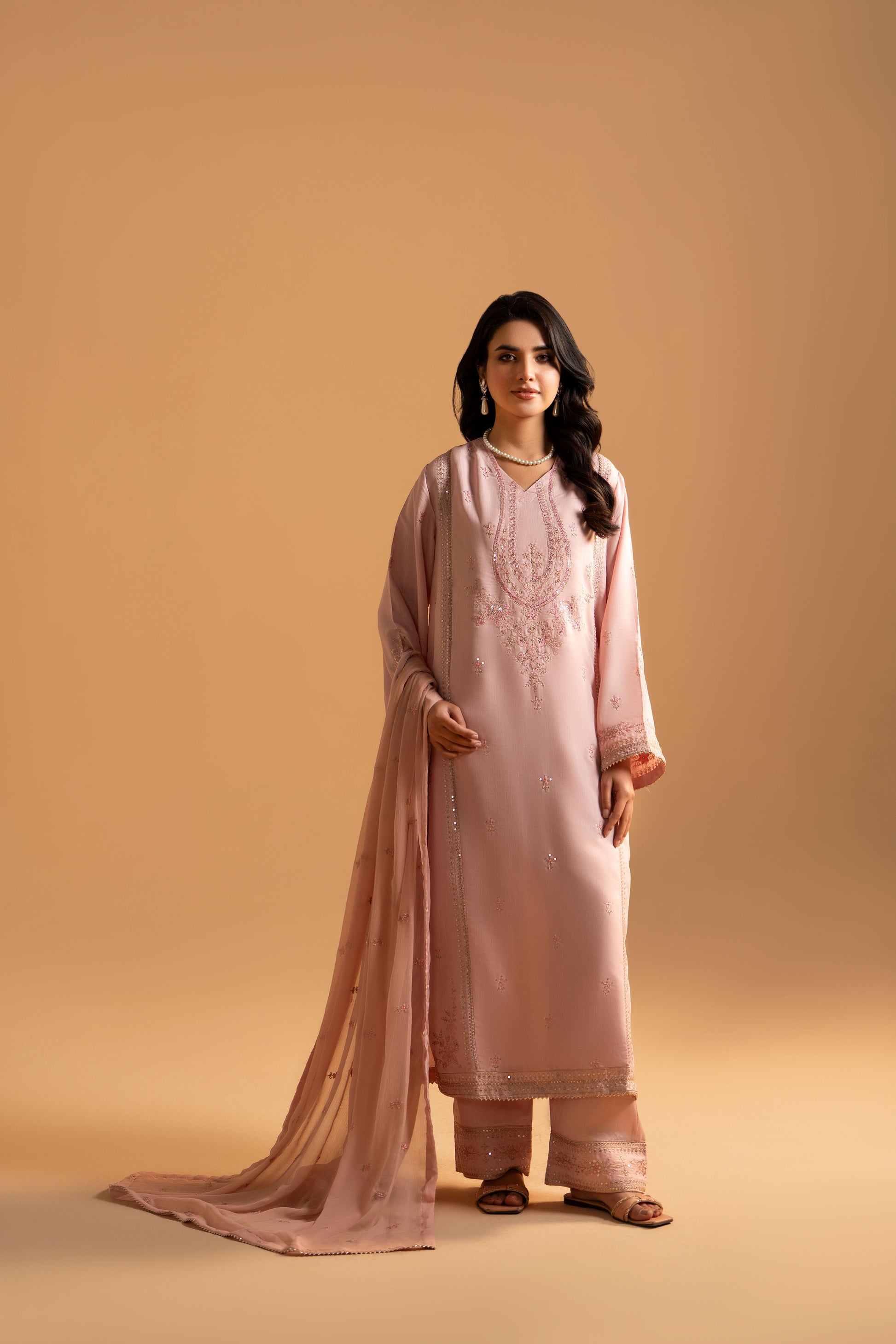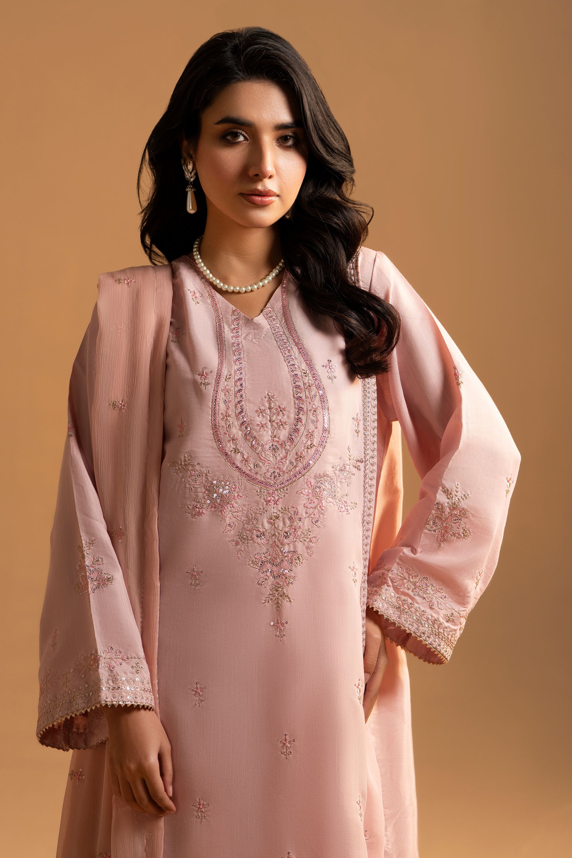 The outfit features a finely embroidered shirt, paired with a printed raw silk trouser that adds depth to the overall look. An embroidered organza dupatta completes the ensemble, bringing a soft contrast and graceful flow to the silhouette.
